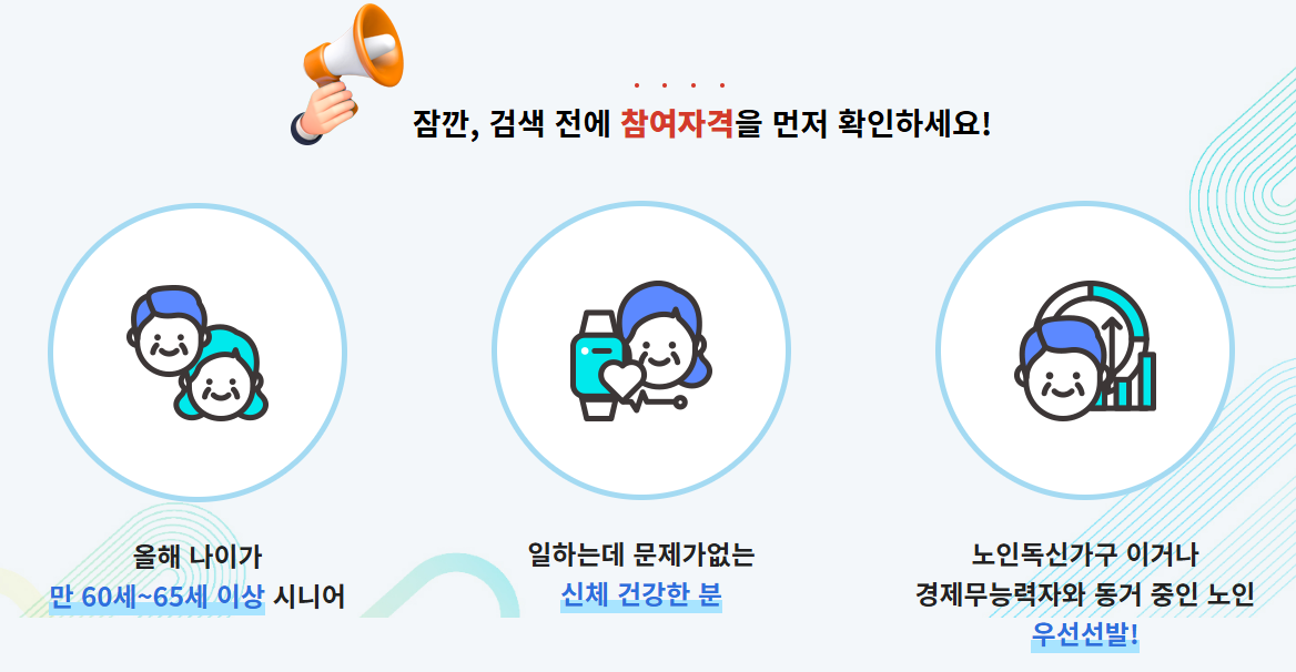 아래 노인일자리 신청 바로가기를 클릭하시면 해당 시군구의 일자리 등을 확인하시고 신청하실 수 있으니 참조하시면 되겠습니다.