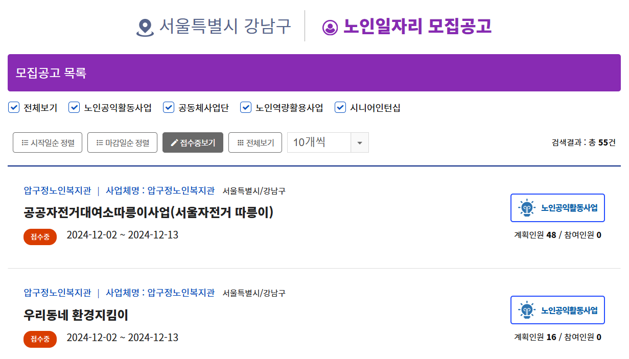 노인공익활동 사업은 65세 이상의 노인들이 자발적으로 참여하여 지역사회의 공익을 증진시키는 활동입니다. 이 사업은 노인들이 사회에 기여할 수 있는 기회를 제공하고, 그 과정에서 자신감을 얻고, 사회적 관계를 형성할 수 있도록 돕는 역활을 합니다. 주요 프로그램으로는 환경개선 활동, 음식배달, 지역사회 서비스등 여러가지 활동이 포함되어 있습니다.