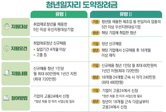 기업에게 신규채용 청년 1인당 1년간 최대 720만원 지원