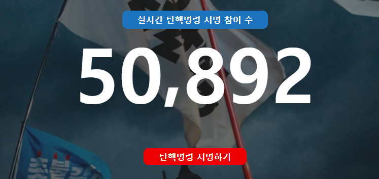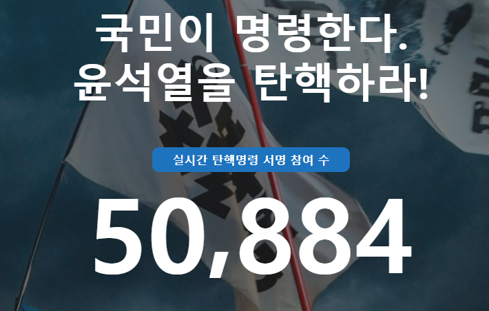 지난 6월 20일 부터 시작된 윤석열 대통령의 탄핵 요구가 주목을 받아 140만명의 동의가 진행된적이 있습니다. 이에 새롭게 탄핵명령닷컴에서 서명운동이 실시되고 있습니다. 관심있으신 분들은 홈페이지 https://yoon-out.com 또는 탄핵명령.com을 통해 서명에 참여할 수 있으며 현재 5만명이 넘는 인원이 참여를 하고 있습니다.